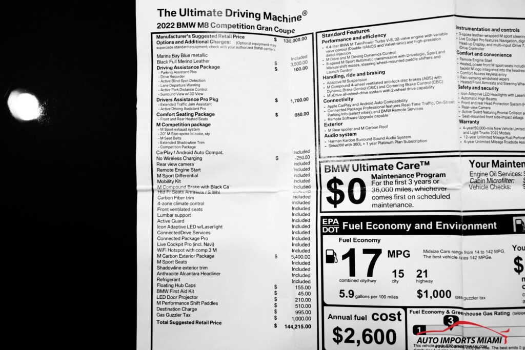 THIS STUNNING AWD 2022 BMW M8 GRAN COUPE COMPETITION HAS A TWIN-TURBOCHARGED 4.4L V8 ENGINE THAT PRODUCES 617 HP AND COMES WITH ALL THE RIGHT EQUIPMENT INCLUDING…….