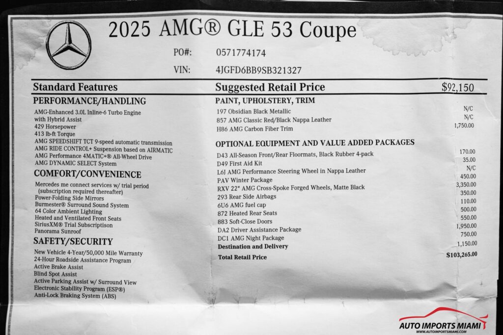 THIS STUNNING 2025 MERCEDES BENZ AMG GLE 53 COUPE HAS A 3.0L 6 CYL TURBOCHARGED ENGINE THAT PRODUCES 429 HP AND COMES WITH ALL THE RIGHT EQUIPMENT INCLUDING…….